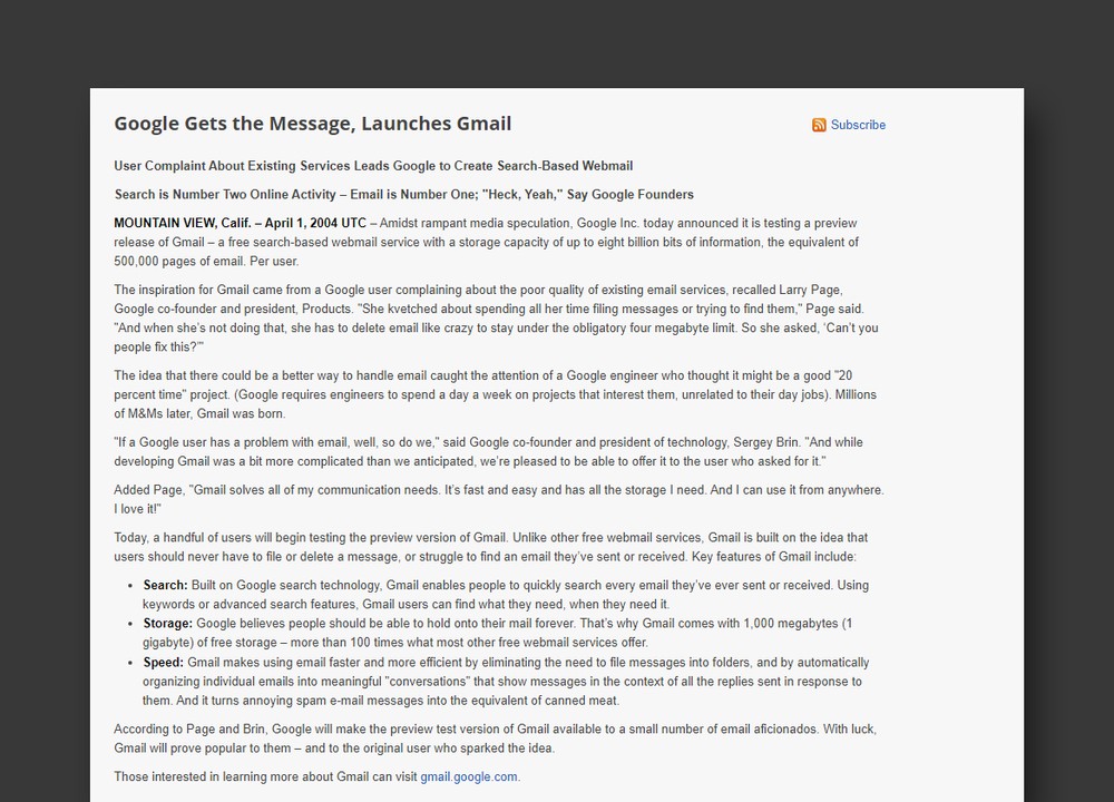 Ha habido mucha desconfianza en torno a Gmail. Además de ser revelado en un comunicado de prensa publicado el Día de los Inocentes de 2004, el servicio de correo electrónico prometía varias funciones en un momento en que dichas plataformas eran limitadas. Sus innovaciones han contribuido a lo que es hoy. Más de 1.200 millones de usuarios.