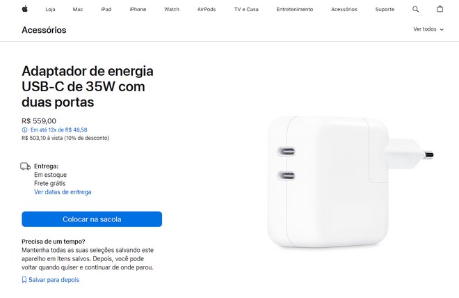 Sin embargo, para aprovechar todas las mejoras, debe abrir mucho el bolsillo. Cargador de doble puerto USB-C de Apple de 35 W Cuesta R$ 559 en el sitio web de Maçãpor el valor de R$ 503,10 en efectivo, después del descuento 10% otorgado con este método de pago.
