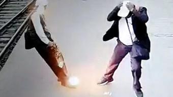 después de tomar Descarga eléctrica loca, el empleado aterriza con fuerza en las vías. Afortunadamente, otros trabajadores del ferrocarril local se movieron rápidamente para salvarle la vida.