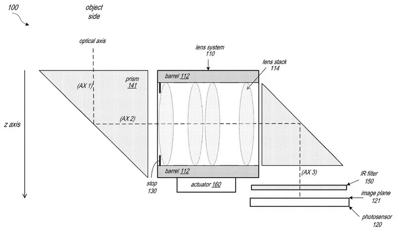 La patente se titula «Cámara plegable» y, según los dibujos, se ajusta a una unidad de periscopio, que incluye dos prismas y un juego de lentes independientes ubicados en el medio. Esta lente se puede mover libremente para combinar funciones como Estabilización óptica y enfoque automático.