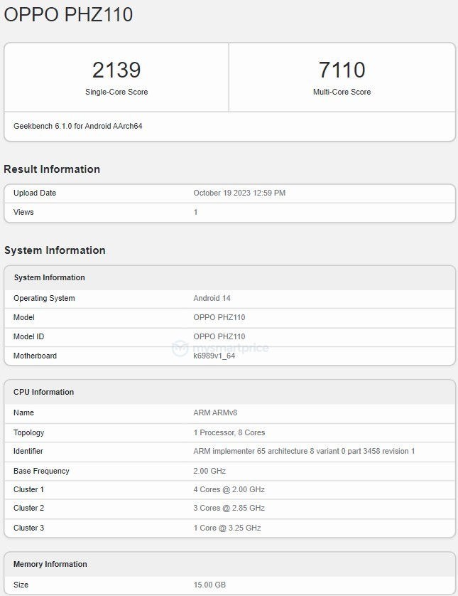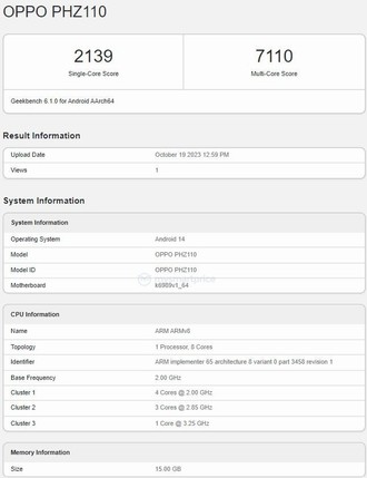 Según información de la base de datos Geekbench, el celular OPPO (PHZ110) está equipado con la plataforma Dimensity 9300 de MediaTek, la cual aún no ha sido anunciada oficialmente. Consta de cuatro núcleos con una frecuencia de 2 GHz, tres con una frecuencia de 2,85 GHz y uno con una frecuencia de 3,25 GHz.
