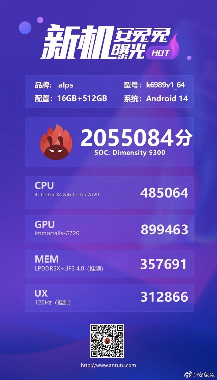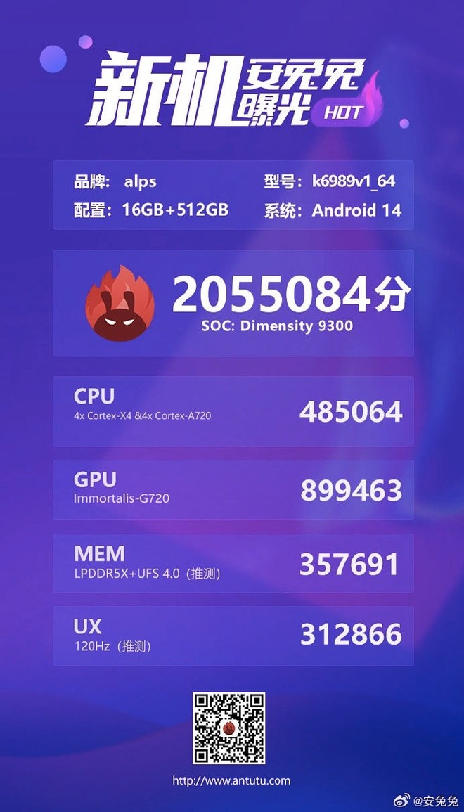 El Dimensity 9300 se probó en un dispositivo con 16 GB de RAM y 512 GB de almacenamiento interno. El punto de referencia obtuvo puntuaciones de 485.064 y 899.463 puntos en las pruebas de CPU y GPU, respectivamente.