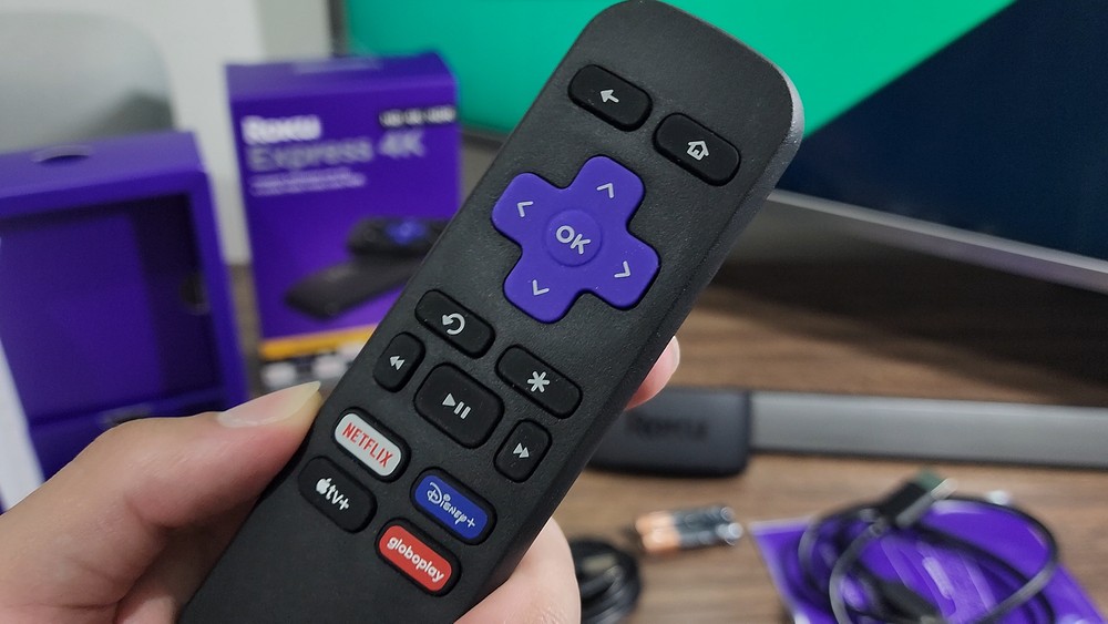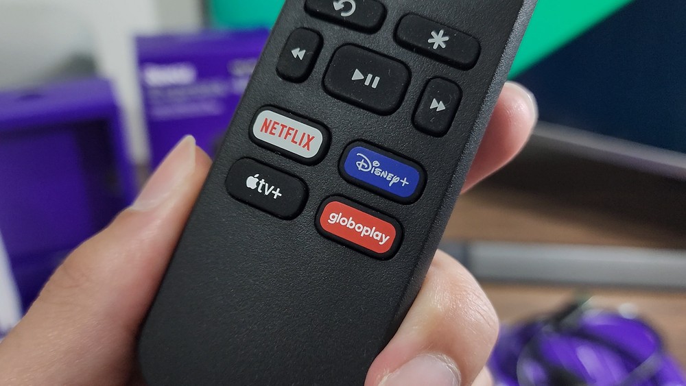 Y hablando del mando a distancia, aquí encontramos el mismo aspecto ya conocido en el modelo básico. Con la diferencia de que este tiene diferentes accesos directos para aplicaciones de transmisión. Incluyen Netflix, Disney Plus, Apple TV Plus y Globoplay. A pesar de ser compacto, es muy completo y viene con 2 baterías en la caja.