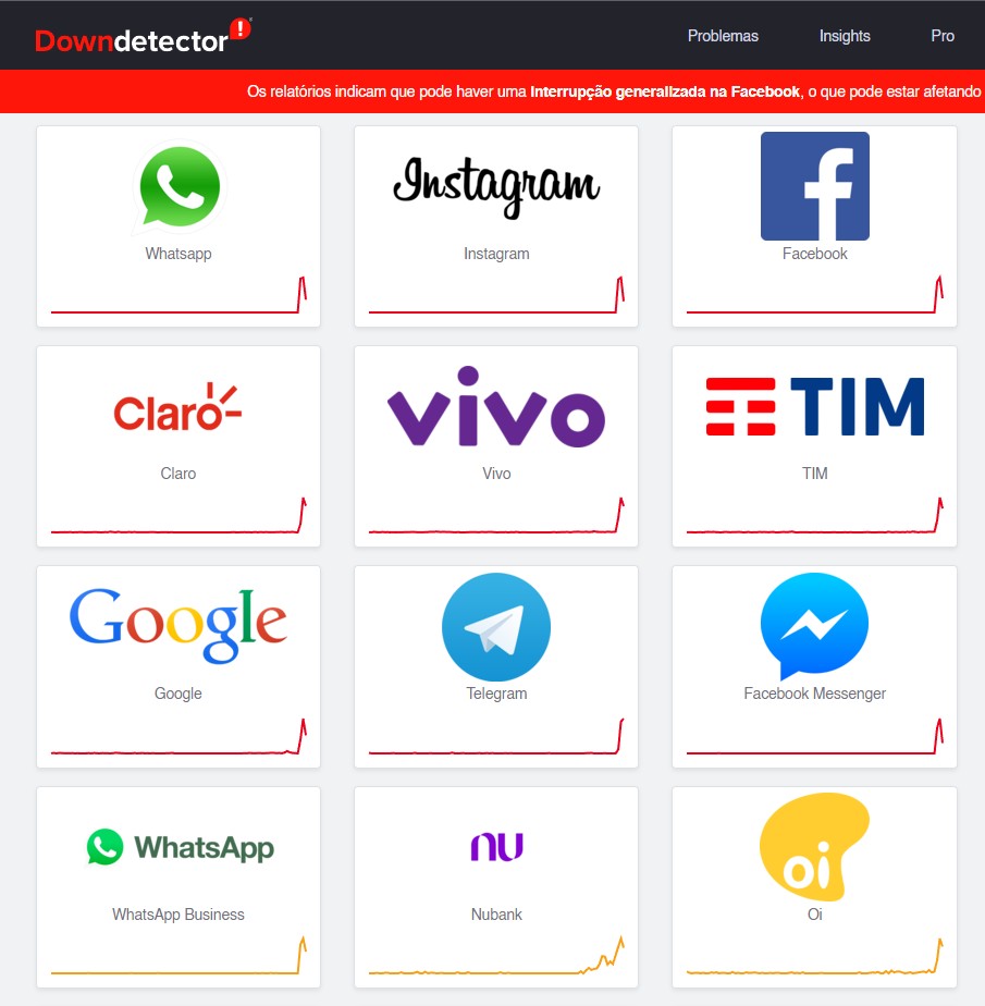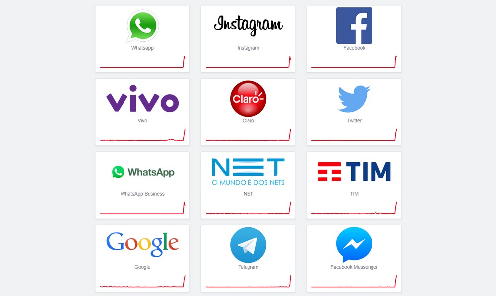 Sin embargo, no son solo los servicios de Facebook los que tienen problemas. Tabla Detector de bajada Muestra picos de inestabilidad en todos los principales operadores de Brasil, como vivoY naturalmenteY ClaroY Hola NS Tim. Los motores de búsqueda de Google y YouTube también aparecen con encabezados en el sitio, como puede ver a continuación.