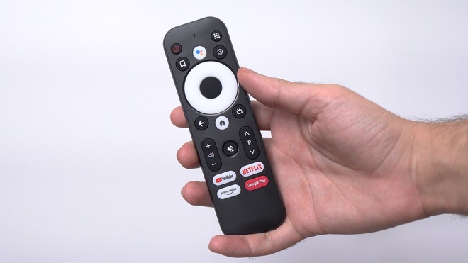 Pero si dejamos de lado estos detalles, pasemos a los otros aspectos del control. Aquí tenemos un botón central para la navegación, botones dedicados para YouTube, Netflix, Prime y Google Play, botones para controlar Box y los propios dispositivos de TV, y un botón dedicado al Asistente de Google.